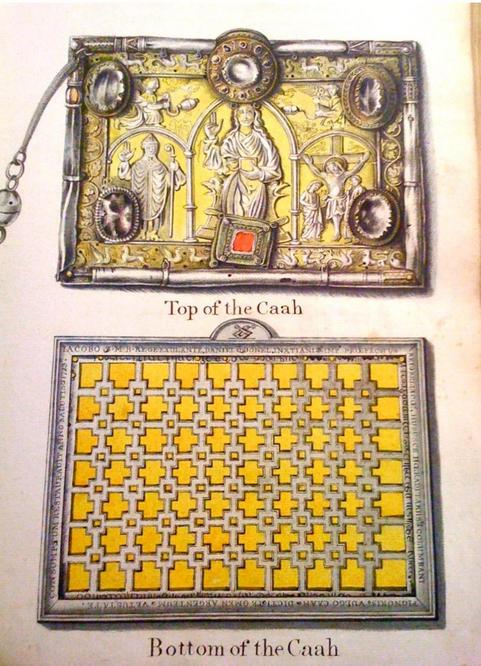 The Cathach is Ireland's most ancient manuscript dating to about 555 AD. St. Colmcille/Columba (521-597), lived in the 6th century AD, and is one of the three patron saints of Ireland, along with Brigid and Patrick. A collateral ancestor, and patron saint, of the O’Donnells of Tyrconnell, he wrote the Cathach psalter (facsimile of a manuscript page below left), converted the pagan Picts, of what later became known as Scotland, to Christianity, founded the monastery of Iona where later Scottish kings were buried. One of our own kin of the Cenel Conaill, and O'Donnell precursor from Loch Gartan in Donegal, as a pre-Schismatic saint, he is venerated by Orthodox, Catholics, and Protestants. He is also inadvertently responsible for the first codification of copyright law in the world, when judged wrong for copying a psalter "to every cow its calf, and to each book (belongs) its copy". That judgment, codified in the Brehon Laws of ancient Ireland caused a war, a regicide, and his exile that led to the conversion of Scotland, and the first codification in ancient Brehon law of the notion of copyright, well over a thousand years before the modern equivalent in the Statute of Anne, the Copyright Act of 1710. The famous copy became the Cathach or battle-book of the O'Donnell dynasty, and Columba went on to found famous monasteries, notably at Iona, in Scotland. His monks also founded the church of St. Germain-en-Laye, outside Paris, where Stuart exiles were laid to rest, and where Sean or Jean Count O'Donnell wed in 1711, founding a dynasty of French O'Donnell counts in France until extinct in 1879. The early Scots were the Irish Gaels who gave their name to their colony, Scotland. The Cumdach (illustration below right), or book-shrine of the Cathach, was once adorned with lapis lazuli that often adorned some such book shrines - evidence of early medieval trade reaching far-off Afghanistan. Click icon for Cathach text: