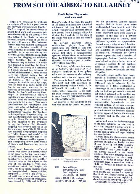 SAOIRSE - Map of the Anglo-Irish War (1919-1921). In 1985, Comdt. Patrick Denis O’Donnell, and his comrade in arms, Comdt. Eoghan O’Regan, both of the Irish Defence Forces, known in Gaelic as Óglaigh na hÉireann (“Warriors of Ireland”), brought out Saoirse (Freedom), a Map of Ireland, focused on the War of Independence (1919-1921), also called the Anglo-Irish War (the latest of many Irish struggles against invasion and colonization) and which O’Donnell had researched at length, covering all of the military incidents of engagements, skirmishes, ambushes and assaults, between Crown Forces (British Army, with the British-controlled Royal Irish Constabulary, and their Auxiliaries) against Irish insurgency forces fighting for Independence. The map gives locations, casualty figures, and a chronology of 30 months of conflict. The map also indicates the regional concentration of incidents more in the southwest than north or east. While he did the research, and tabulations, the map design was done by Comdt. O’Regan, who also wrote the article here which appeared published in An Cosantóir, the Irish Defence Journal to which Comdt. O’Donnell was a regular subscriber and a frequent contributor. The map was published by Léaráid Maps of Dun Laoghaire on a scale of 1:575,000, and sized 32” X 24” (inches). The I.R.A. indicated on the map indicates the old Irish Republican Army precursor of what became in time the national official Irish Army, and should not be confused with the banned paramilitary entity that later arrogated the same name and acronym.