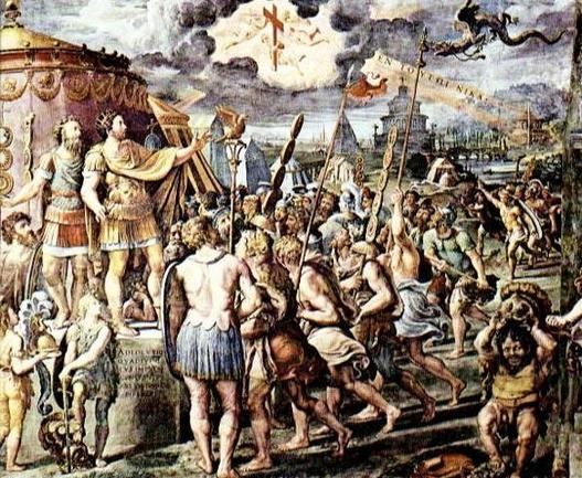 The Vision of the Cross, Emperor Constantine the Great's vision before the Battle of the Milvian Bridge (by the School of Raphael in the Sala Costantino, Apostolic Palace, Vatican). The vision inspired the grant of the Arms of the Holy Cross by Saint Patrick to Conall, ancestor of the O'Donnells, and the motto,In Hoc Signo Vinces, which appears in Greek in this painting: "Εν τούτῳ νίκα" (by this sign, conquer).